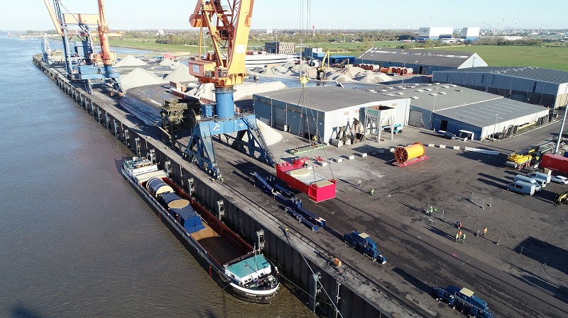 Auch in Zeiten von Corona tätigt Brunsbüttel Ports Großinvestitionen im Hafen. Große und schwere Kran-Komponenten werden mit eigenem Kran entladen. Umweltbewusster Transport der Komponenten erfolgte mit dem Binnenschiff über den Wasserweg.